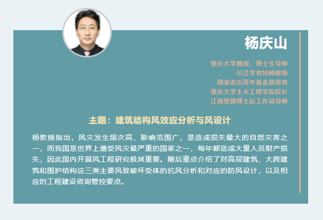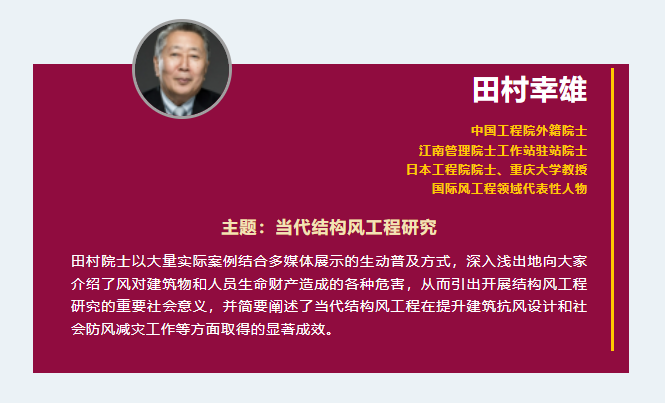 為了進一步幫助廣大浙江省內咨詢單位從業人員提升眼界,拓寬視野,提高專業技術水平,促進產學研成果轉化應用,賦能行業轉型升級,4月21日下午,浙江江南工程管理股份有限公司和浙江省全過程工程咨詢與監理管理協會聯合主辦的建筑領域前沿技術系列講座在杭州市三立開元名都酒店圓滿舉行。講座由中國工程院外籍院士、江南管理院士工作站駐站院士、國際風工程知名學者田村幸雄教授領銜,與重慶大學土木工程學院院長、長江學者、江南管理博士后工作站導師楊慶山教授,江南管理博士后胡偉成、劉念武一道,為大家帶來一場學術與專業的知識盛宴。